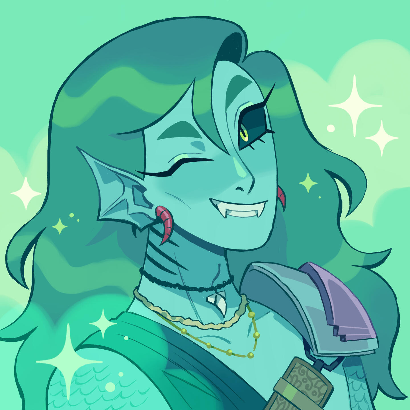As a triton, Reides can breathe underwater and has spent most of his life in the sea. He was born in Aquos, a city located in the undersea kingdom of Laverathia, on the 16th day of Firstlight in the year 569. Reides kept his past as a fiercely guarded secret for a time, but gradually formed a deep bond with the party and eventually trusted them enough to reveal his true identity. Namely, he confessed that his full name is Reides Aurelian Yon-Zinthos Kien-Khavas Laverath, that he is a prince of Laverathia, and that he is second in line to the throne. He also told them that he considers himself ill-suited to his status, viewing his relationship with his people as "not bad [...] but distant." His desire to escape from the crown and to be able to live as his own person resulted in a fixation on the surface world, which came to represent freedom to him.Reides has two brothers and one sister. Though the two seem to care about each other, he has a strained relationship with his older brother, Viglis. He is very close to his younger sister, Lotlyn.Eventually, Reides asked his father, the current Emperor of Laverathia, for permission to act as an ambassador of sorts between the undersea and surface worlds. This would also serve to increase the tritons' breadth of knowledge about the surface and possibly even reduce the isolationistic nature of the kingdom. Unfortunately for Reides, his father did not take kindly to this - accusing Reides of treason and locking him away in a room for weeks upon weeks.Reides does not know any of the specifics surrounding his liberation. All he knows is that Lotlyn managed to open the locked doors one night and encouraged him to go to the surface world. During his time on the run, he was able to gain passage to Port Valor with the help of a kind stranger who was working on a ship. While he did not learn the name of this surfacer at the time, Reides considers him as his first friend.Reides lived in Port Valor for around a year before meeting the party. A lot of the customs of the surface world still fly right over his head, but he's very enthusiastic about attaining more and more knowledge about it. His time away from Laverathia also gave him a new, less irresponsible perspective on his duties as a triton. Reides truly loves the world - both its surface and its seas - and wants to play a role in protecting it.